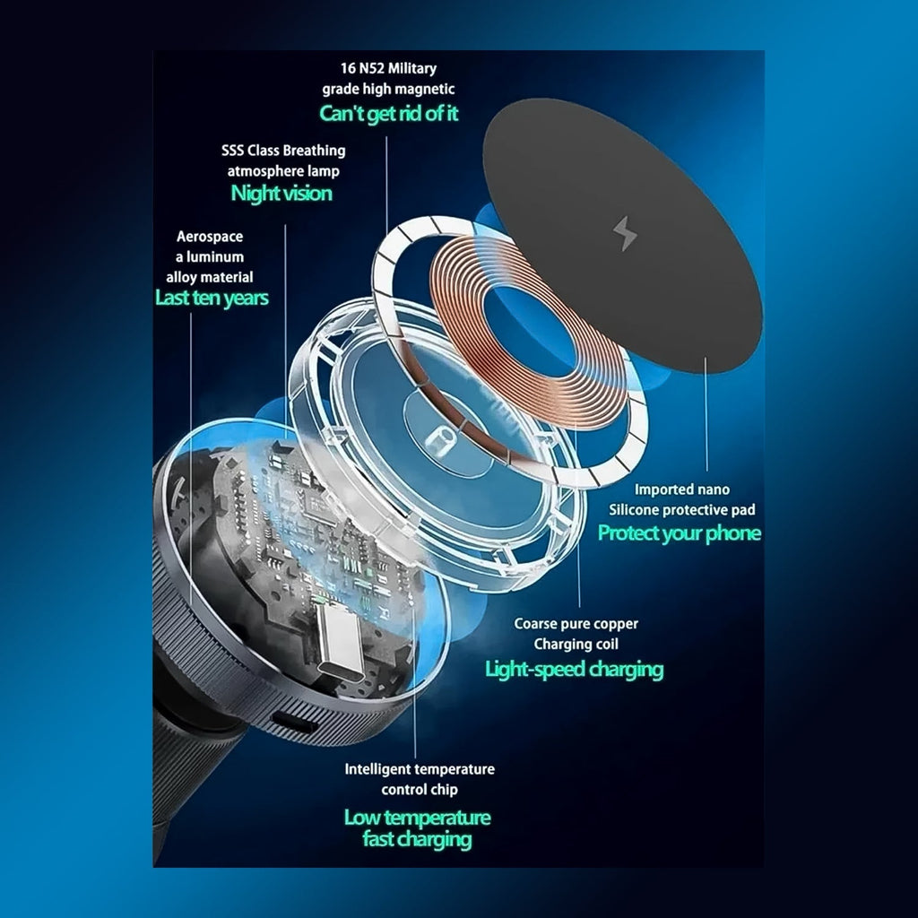 • Music Reactive Lighting with the for Magnetic Phone Mount Wireless Charger. As you drive, the atmospheric lighting responds to the rhythm and beats of your music. This creates a vibrant and dynamic visual experience, transforming your car into a moving light show. This inspiring feature makes the not just a car cell phone holder or a car charger for iPhone, but a unique gadget that adds a touch of fun and excitement to your car journeys.